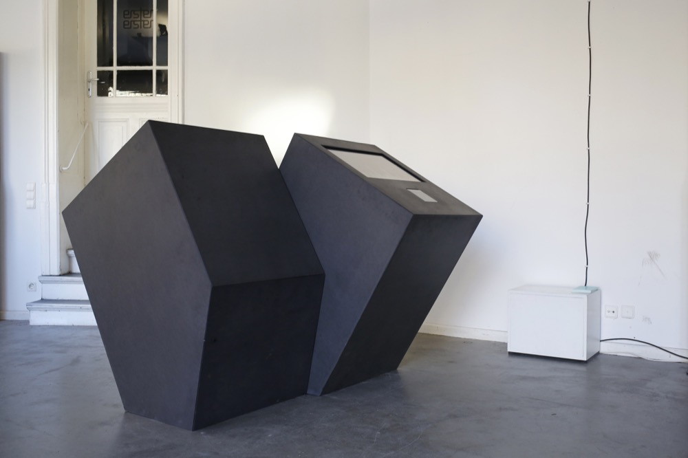 Das Ausstellungskonzept von Streams and Traces besteht aus vier verschiedenen Ausstellungsmöbeltypen, die in unterschiedlichen Varianten eingesetzt werden. Es umfasst zwei wandhohe Bildschirmkorpusse, zwei große Terminals, vier Säulenpodeste und eine mobile Tablethalterung. Bei der Gestaltung der Möbel haben wir uns vom fünfeckigen Grundriss des Ausstellungsraums inspirieren lassen und diesen als Grundlage für die Formsprache der Möbel verwendet. Für die verschiedenen Möbel wurde diese Polygonform gedreht, extrudiert und multipliziert. Die Ausstellungsmöbel zeigen so eine hohe Formvarianz, bilden aber durch die Ausgangsform eine visuelle Einheit. Als Material wurde schwarz-durchgefärbtes MDF verwendet, dessen Oberfläche bewusst nicht versiegelt wurde. Die Besucher lassen so, mit der Zeit, ihre ganz eigenen Spuren auf der Oberfläche der Ausstellung zurück. Die Möbel wurden von Samira, Andrea and Christian an der Fachhochschule Potsdam mit hilfreicher Beratung von Anne Boenisch gebaut.
